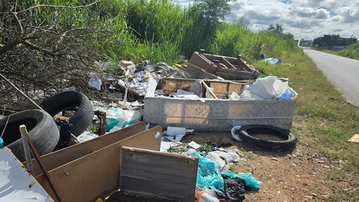 Entre os materiais encontrados estão caixas de remédios, pneus velhos, sofás, camas, restos de móveis, entulho de construção, sacolas plásticas e diversos resíduos domésticos. Em um dos pontos, há inclusive descarte de embalagens de medicamentos, o que pode representar risco ainda maior ao meio ambiente e à saúde pública.