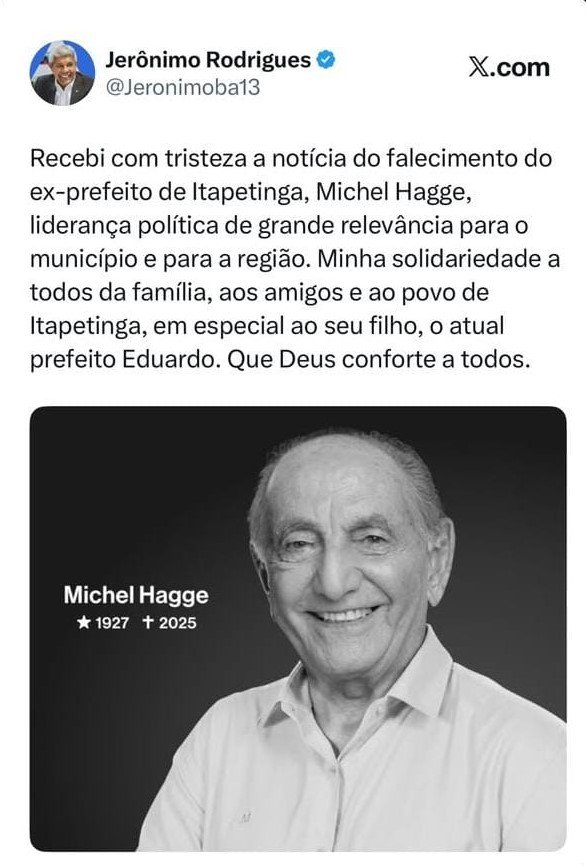 O governador da Bahia, Jerônimo Rodrigues, manifestou pesar pelo falecimento do ex-prefeito de Itapetinga, Michel Hagge, ocorrido nesta quarta-feira (1º). Em publicação nas redes sociais, o chefe do Executivo estadual destacou a relevância da liderança política de Hagge para o município e para toda a região.