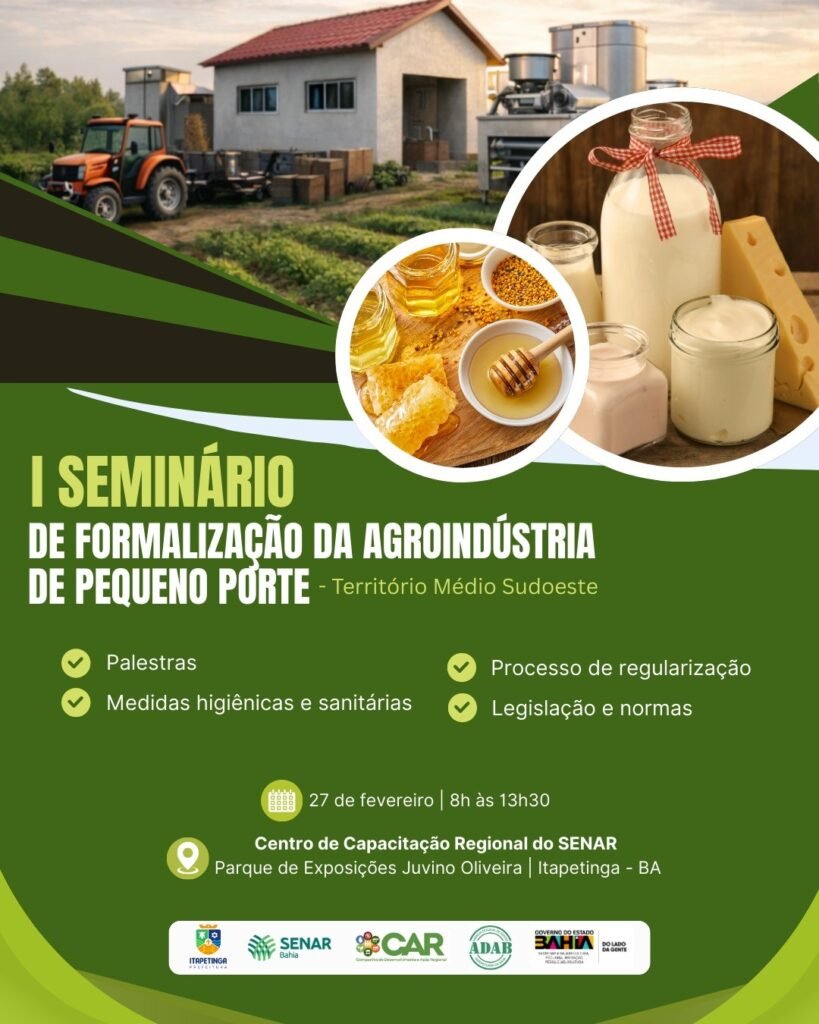 Itapetinga será sede do I Seminário de Formalização da Agroindústria de Pequeno Porte – Território Médio Sudoeste, evento voltado para produtores, empreendedores rurais e profissionais ligados ao setor agroindustrial.