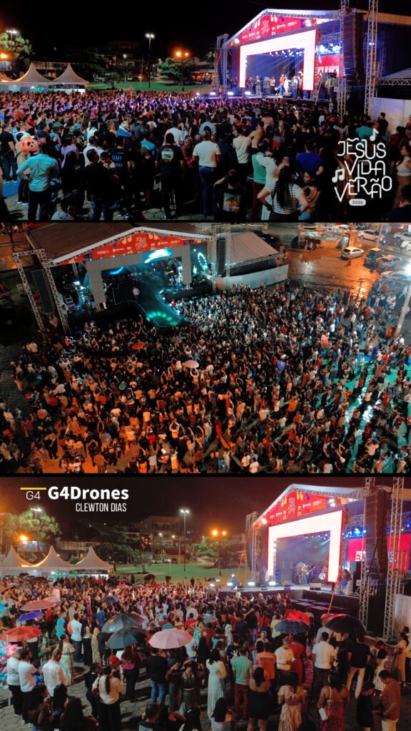 Desde cedo, o público já mostrava que a noite seria especial. Famílias inteiras, jovens, crianças e pessoas de todas as idades lotaram o espaço do evento, criando um verdadeiro cenário de comunhão e alegria. Nem mesmo a chuva foi capaz de afastar quem decidiu viver esse momento. Pelo contrário — muitos permaneceram firmes até o último minuto, mostrando a força e a importância do Jesus Vida Verão para a cidade e toda a região.